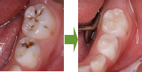初期虫歯あるいは虫歯になる危険性が高い歯がある場合は、歯を専用器具にて清掃した後、表明処理を行いフッ化物が徐々に放出される樹脂(シーラント剤)で溝や穴を埋めます。清掃の結果、虫歯の可能性が高い場合は、歯を削るなど虫歯治療が必要なことがあります。