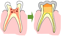 神経に達する深い虫歯がある場合は、局所麻酔後、虫歯になってしまった歯質と歯の神経の一部または全体の除去と消毒を行い、お薬をつめます。その後、経過が良好な場合は、前歯では全体を白いレジン樹脂で覆ったり、奥歯では金属製のかぶせ物をします。処置後、お痛みや歯根周囲への虫歯菌の感染があった場合には、再度治療が必要なことがあります。