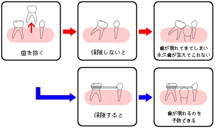 虫歯により歯が溶けてしまいほとんど残っていなかったり、抜け替わり間近の乳歯が虫歯になった場合や歯根周囲への虫歯菌の感染が強い場合は、局所麻酔後、抜歯をします。次の永久歯が生えるまでに3ヶ月以上かかる可能性がある場合は周りの歯が抜歯したスペースに移動しないように保隙が必要です。(保隙は保険適用外です。)