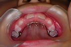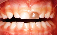 外傷の状況やその後の治療経過によっては、歯を残せない場合もあります。抜歯後、しばらく(3~6か月以上)次の歯が萌えない時期は、見た目やお食事、お話の仕方への影響を最小限にするために人工の歯を入れることをお勧めします。(保険適用外)